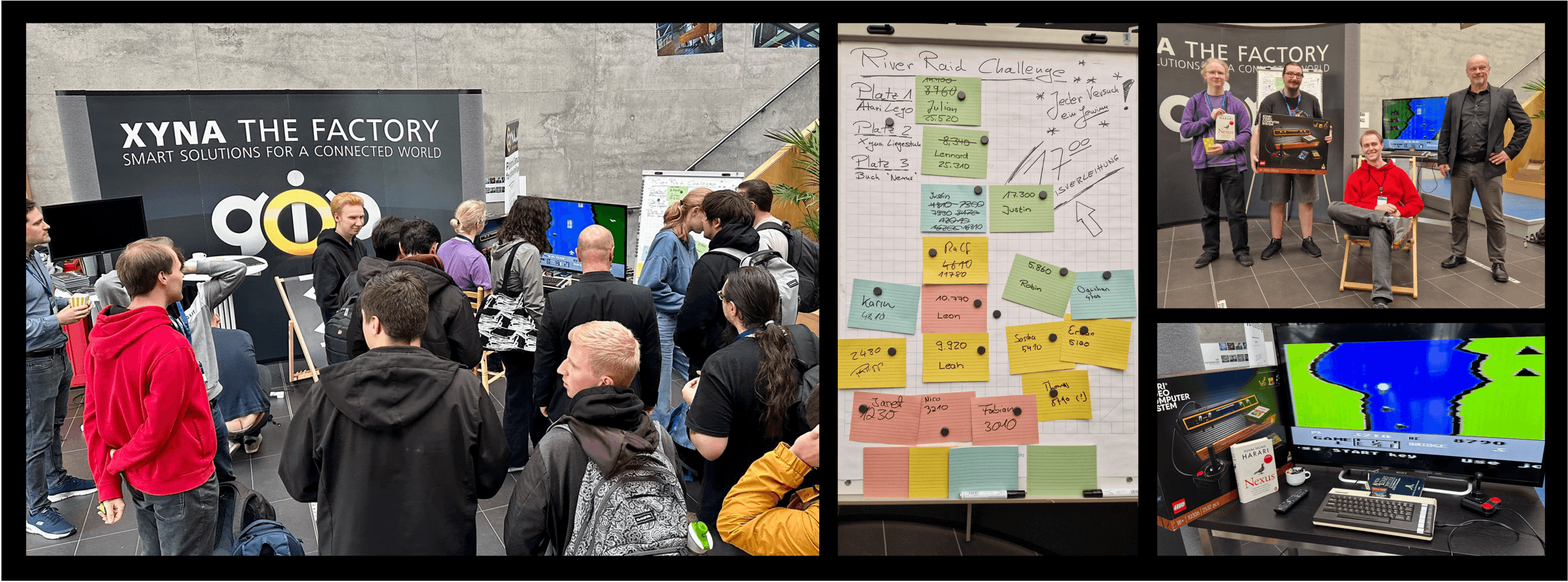 Neben den Vorträgen war Xyna auch mit einem Messestand in der Ausstellung vertreten. Neben der Möglichkeit, die Workflow-Automatisierung mit Xyna Factory live zu erleben, inklusive der im Vortrag von Dr. Krause gezeigten OAS / TMF API-Automatisierung, gab es in diesem Jahr ein ganz besonderes Highlight: einen original Atari 600 XL (https://en.wikipedia.org/wiki/Atari_600XL) mit River Raid Challenge und tollen Gewinnen – und am Ende tollen Gewinnern mit beeindruckendem High-Score!