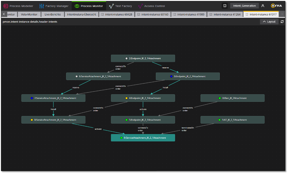 And because we've been able to support interesting customer projects in this context over the past few months, which focus on implementing such IbO systems, Xyna has also learned a lot in this area: for example, the Xyna Scheduler (part of the server) can process appropriately prepared intents using the order recurrence function – and the Xyna Process Monitor can, and this is truly new, also visualize the generated graphs: