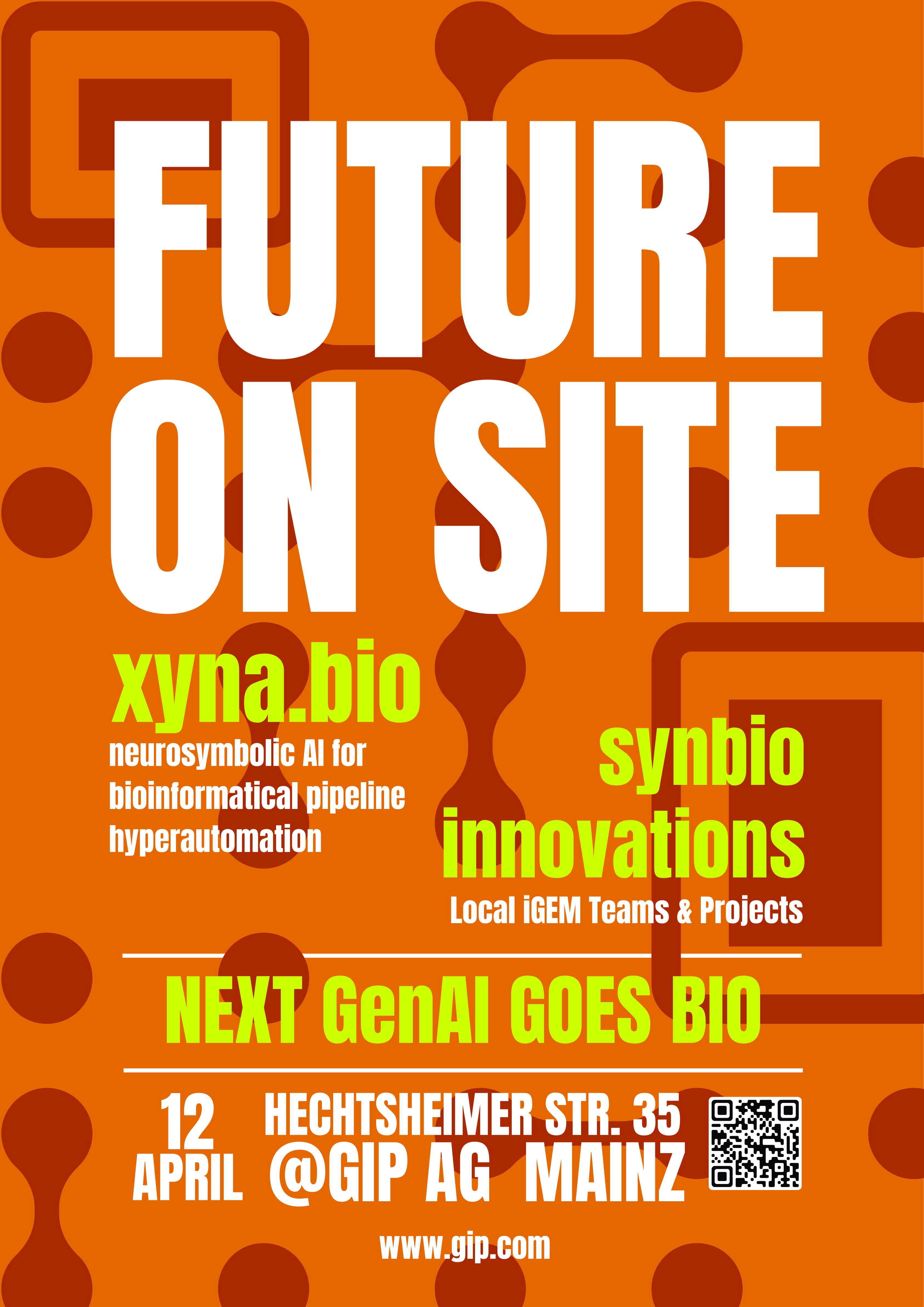 Join us on the 12. April at the GIP headquarters in Mainz where we'll demonstrate xyna.bio in action, discuss the future of bioinformatical hyperautomation and share visions with local iGEM Teams, students and professionals.